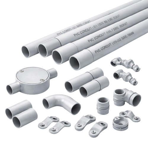 PVC Conduit Pipes and Accessories are widely used for safe and organized electrical wiring systems in residential, commercial, and industrial installations. Made from high-quality PVC material, these conduits provide excellent insulation, durability, and resistance to corrosion and moisture.